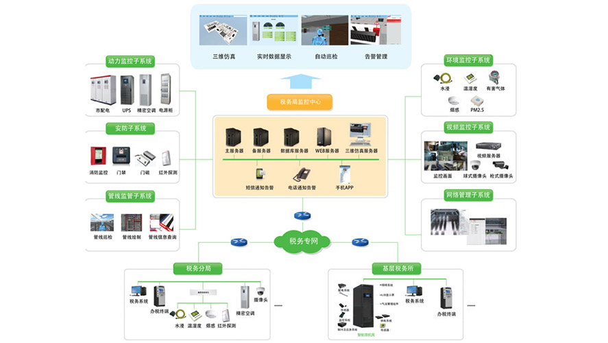 基于3D虚拟仿真技术对实景进行1:1还原,能够实现基于三维环境对信息机房、机柜和各类设备的管理,构建信息机房环境、设备和管理信息的可视化平台,真实呈现监控对象的外观、位置及状态,清晰直观的掌握IT运营中的有效信息,实现透明化与可视化的管理;提供手机APP,实现全天候全地域查看设备的状态、设备视频等功能;具备三维巡检功能,模拟真实环境下对机房进行巡检的过程。